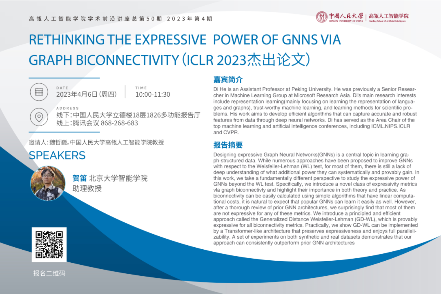报告摘要:Designing expressive Graph Neural Networks(GNNs) is a central topic in learning graph-structured data. While numerous approaches have been proposed to improve GNNs with respect to the Weisfeiler-Lehman (WL) test, for most of them, there is still a lack of deep understanding of what additional power they can systematically and provably gain. In this work, we take a fundamentally different perspective to study the expressive power of GNNs beyond the WL test. Specifically, we introduce a novel class of expressivity metrics vla graph biconnectivty and highlight their importance in both theory and practice. As biconnectivity can be easily calculated using simple algorithms that have linear computational costs, it is natural to expect that popular GNNs can learn it easily as well. However, after a thorough review of prior GNN architectures, we surprisingly find that most of them are not expressive for any of these metrics. We introduce a principled and efficient approach called the Generalized Distance Weisfeiler-Lehman (GD-WL), which is provably expressive for all biconnectivity metrics. Practically, we show GD-WL can be implemented by a Transformer-like architecture that preserves expressiveness and enjoys full parallelizability. A set of experiments on both synthetic and real datasets demonstrates that our approach can consistently outperform prior GNN architectures.