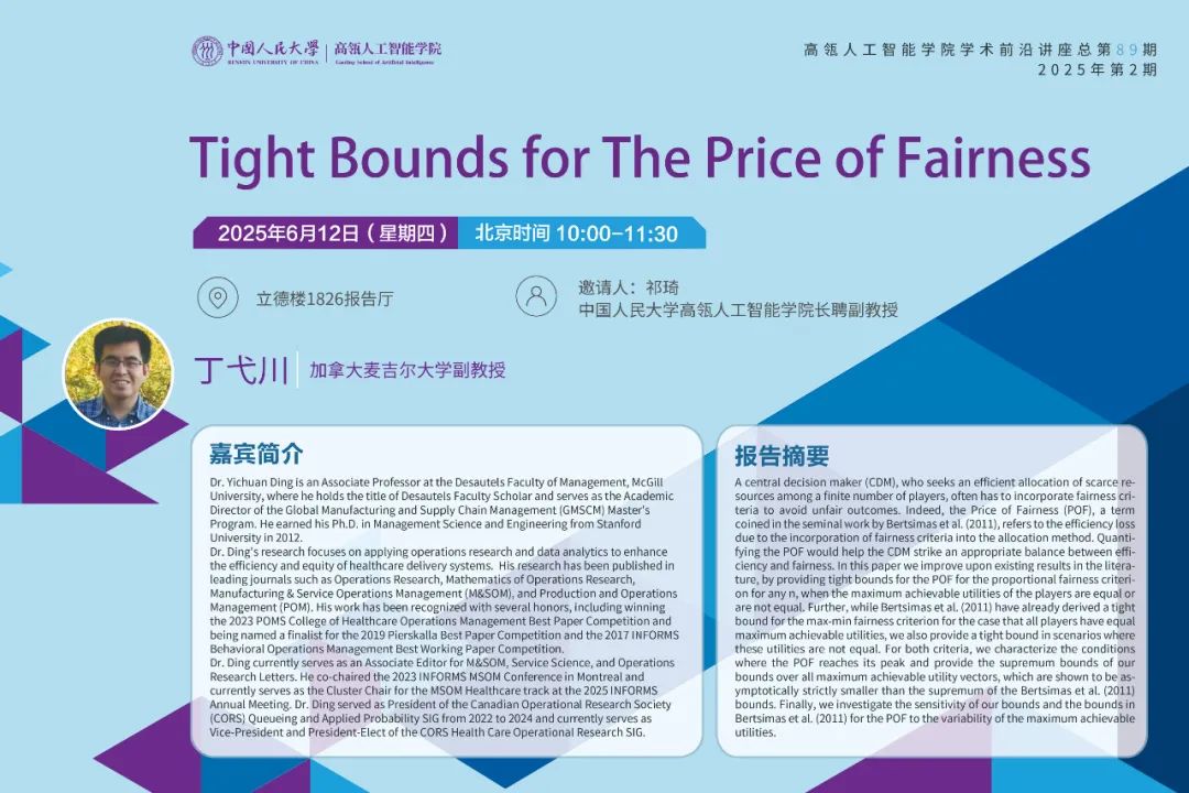 报告人简介:Dr. Yichuan Ding is an Associate Professor at the Desautels Faculty of Management, McGill University, where he holds the title of Desautels Faculty Scholar and serves as the Academic Director of the Global Manufacturing and Supply Chain Management (GMSCM) Master's Program. He earned his Ph.D. in Management Science and Engineering from Stanford University in 2012.