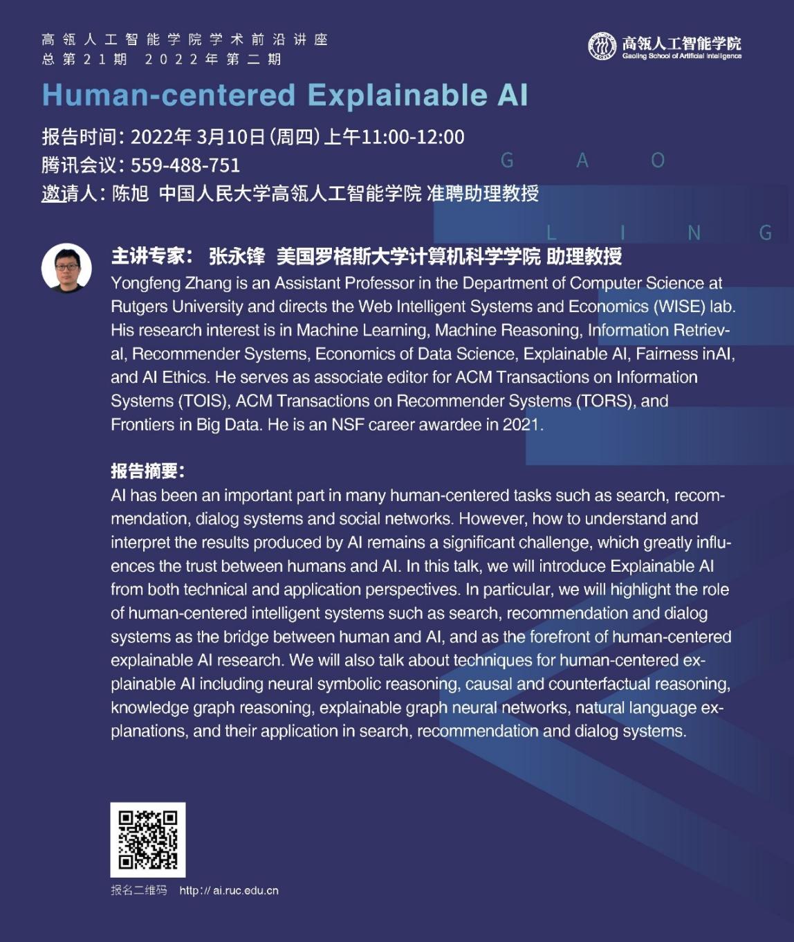 AI has been an important part in many human-centered tasks such as search, recommendation, dialog systems and social networks. However, how to understand and interpret the results produced by AI remains a significant challenge, which greatly influences the trust between humans and AI. In this talk, we will introduce Explainable AI from both technical and application perspectives. In particular, we will highlight the role of human-centered intelligent systems such as search, recommendation and dialog systems as the bridge between human and AI, and as the forefront of human-centered explainable AI research. We will also talk about techniques for human-centered explainable AI including neural symbolic reasoning, causal and counterfactual reasoning, knowledge graph reasoning, explainable graph neural networks, natural language explanations, and their application in search, recommendation and dialog systems.