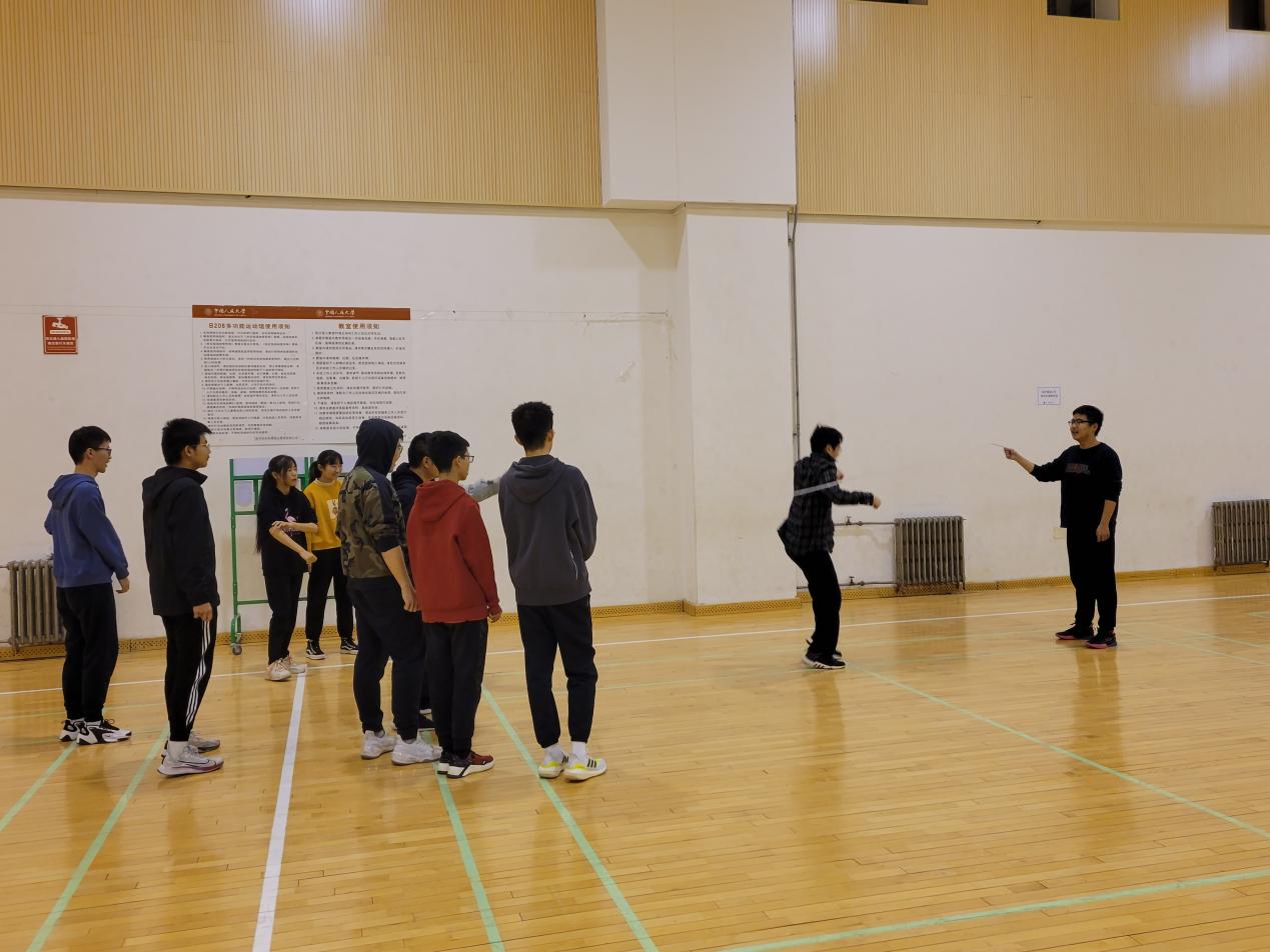 “沙场点兵”不单是智慧和身体控制的比拼,也是团结和协作的考验。在短暂商讨策略后,三个成员相互配合:“指挥官”在场外观察局势,“士兵”在场中听着“司令员”的指令蒙眼蹲踞前行,体现着团队间无言的默契和信任。在场同学屏息凝神,或是欢呼喝彩,场上成员的一举一动牵动着所有人的心弦,热情与斗志就此点燃。