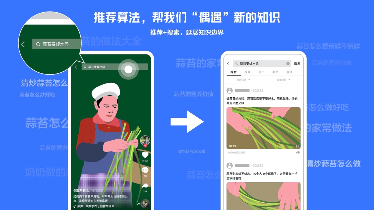 图8:贵州返乡创业青年丁浪用抖音号@黔东农仓 记录腌蒜苔制作过程。在推荐系统的帮助下:1)视频能被准确推荐给对乡村美食、农特产品感兴趣的用户;2)用户能顺势在同屏搜索框中搜索、了解蒜苔烹饪相关内容,扩展相关知识。