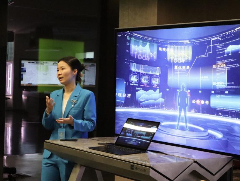 众人来到微软展厅,在工作人员的讲解中,了解微软研发的各项产品,充分体验AI技术的发展变迁。同学们通过与ChatGPT模型交流,MR混合现实的亲身体验,体会到人工智能巨大的发展潜力和迅猛的发展趋势。除此之外,同学们还了解到人工智能在城市治理、风险规避、智能决策等方面的研究成果,通过多因子评估可实现对政策公告未来走向的预测。人工智能在社会公益、环境治理中也发挥着重要作用,大模型训练可以实现盲人有声阅读,利用VR可实现医疗器械装配实时教学,通过可持续化创新项目微软力求实现零碳目标。