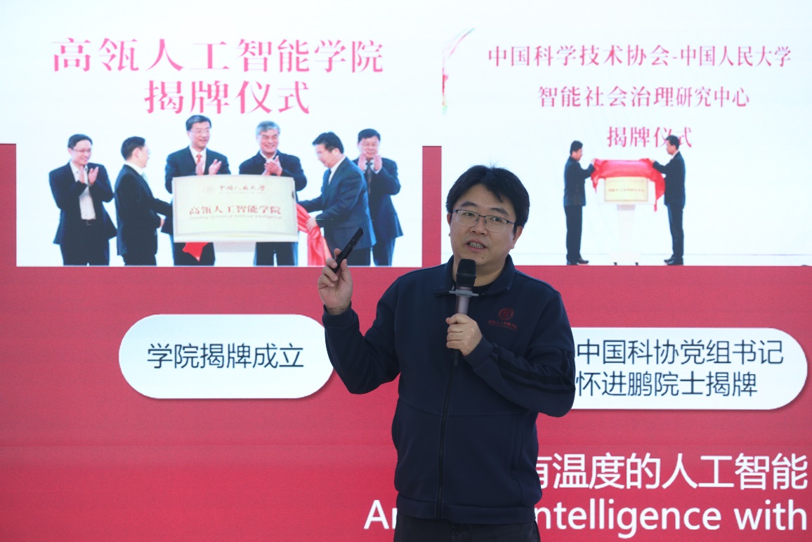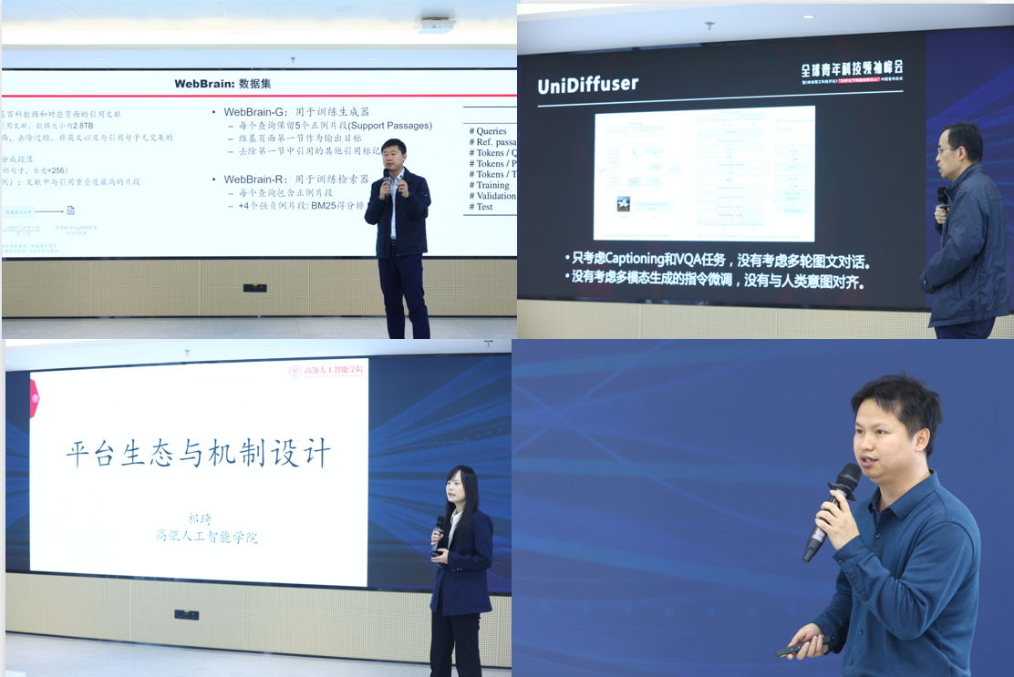 主题汇报环节,荔枝视频 副院长窦志成教授、卢志武教授、祁琦长聘副教授、黄文炳准聘助理教授四位老师分别介绍了各自的研究成果。窦志成进行了主题为“信息检索新范式:检索与生成融合”的报告,介绍了学院在信息检索领域的研究情况以及WebBrain模型的相关情况。卢志武进行了主题为“多模态通用生成模型的思考与实践”的报告,介绍了多模态通用生成模型的最新进展和落地成果。祁琦以“平台生态与机制设计”为主题,介绍了在流量竞争机制、最优扶持机制、多目标机制三方面的研究成果。黄文炳以“图神经网络设计及应用”为主题进行报告,围绕图的表示、生成与决策三大任务,介绍如何设计图机器学习方法和图神经网络模型,挖掘图数据内在的拓扑和几何结构,解决药物发现、3D物理场景模拟、智能体行为决策、社交网络分析等跨领域重要问题。