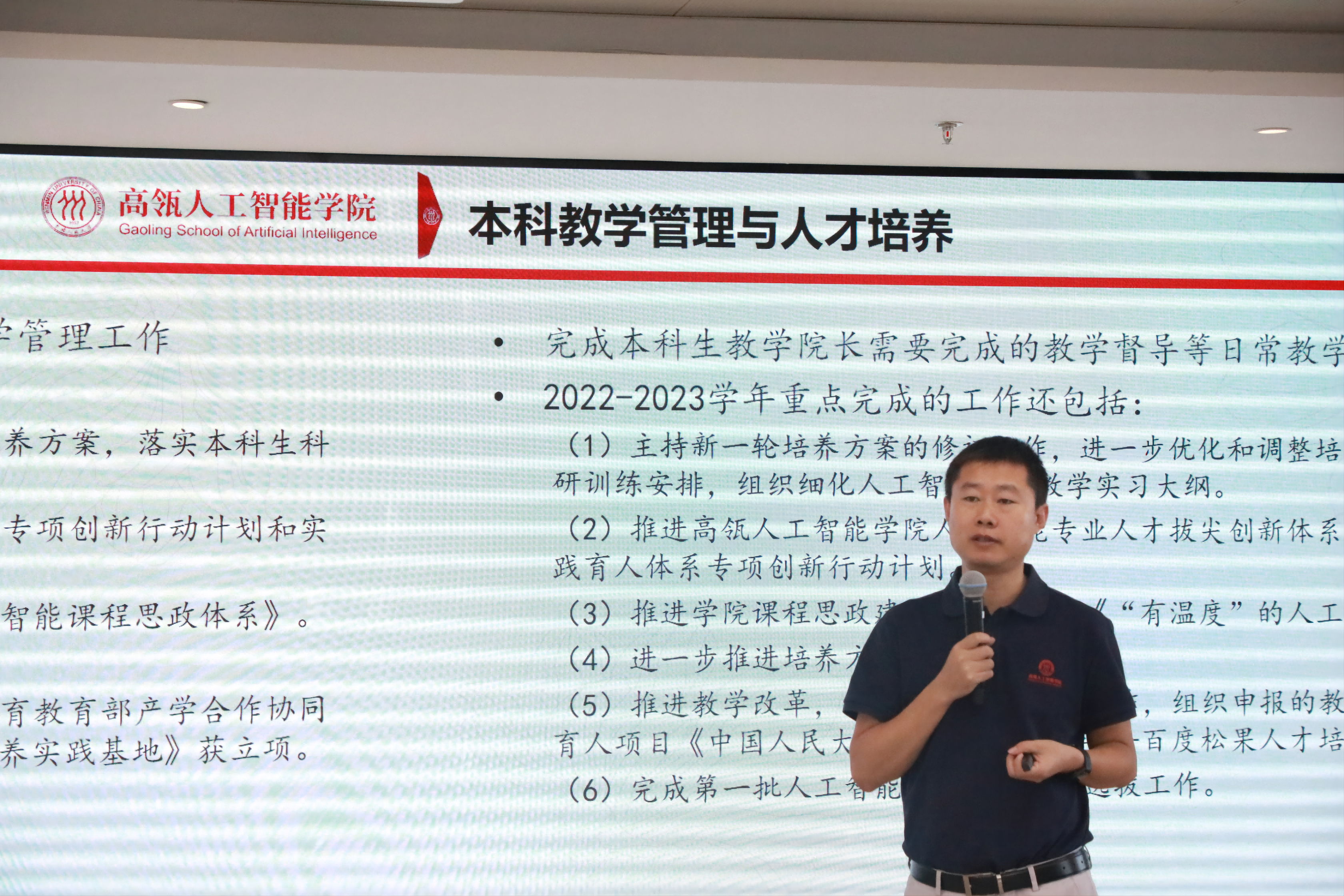会上,文继荣院长作2022-2023学年学院整体及个人工作报告。文院长陈述了本学年的主要工作实绩:本学年学院学科建设取得跨越式发展,计算机科学与技术学科在教育部第五轮学科评估中获突破性进展,跻身“强优”行列,筹建成立苏州智慧治理学院;发布了YuLan系列大模型,持续推进有组织的科研。文院长指出,人工智能学院建院之初设定的五年奋斗目标已经实现,未来五年的发展蓝图如何擘画,还需师生们齐心协力,奋勇开拓。