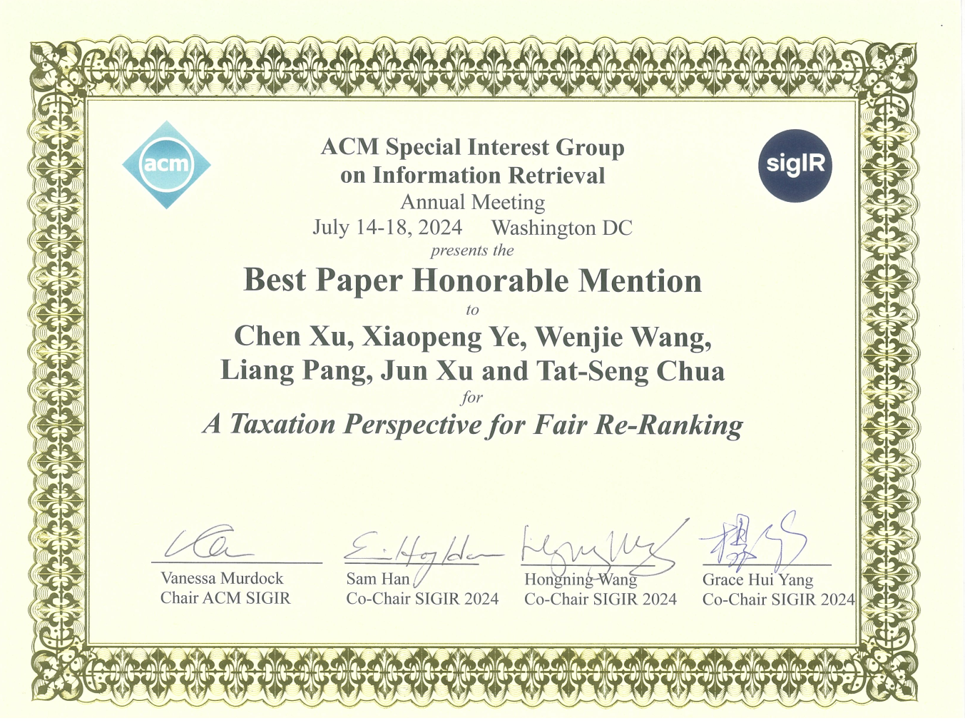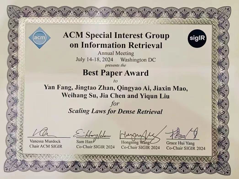 7月17日,信息检索领域国际学术会议SIGIR 2024正式公布了论文获奖名单,荔枝视频 师生参与的4篇论文获奖。徐君教授团队论文“A Taxation Perspective for Fair Re-ranking”获得了长文最佳论文提名奖(Best Paper Honorable Mention Award), 毛佳昕副教授参与的长文“Scaling Laws for Dense Retrieval”被评为最佳论文奖(Best Paper Award)。徐君教授作为通讯作者的短文“ReCODE: Modeling Repeat Consumption with Neural ODE”,毛佳昕副教授作为通讯作者的演示论文“CoSearchAgent: A Lightweight Collaborative Search Agent with Large Language Models”获得了最佳短文提名(Best Short Paper Nominees)。