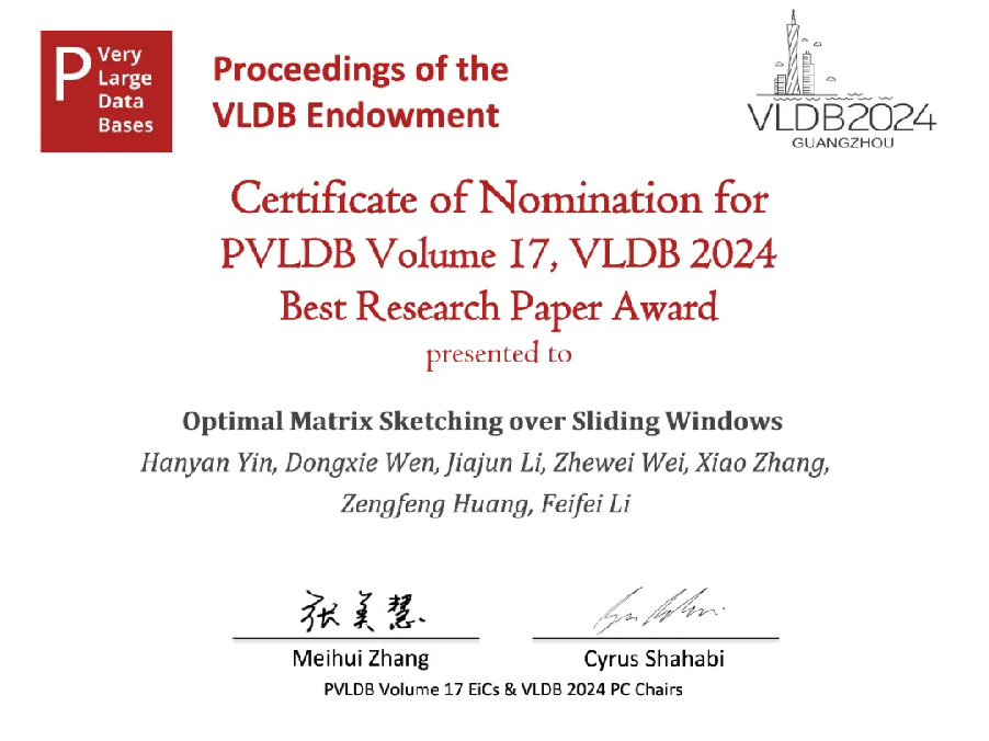 8月29日,数据管理与数据库领域国际学术会议VLDB 2024公布了论文获奖名单,荔枝视频 魏哲巍教授、张骁助理教授与复旦大学黄增峰教授、阿里巴巴集团李飞飞博士合作的论文“Optimal Matrix Sketching over Sliding Windows”获得了最佳论文提名奖(Best Research Paper Nominations)。魏哲巍教授担任本文通讯作者,其与张骁助理教授指导的硕士生尹涵燕、博士生文东勰和李家郡为学生作者。VLDB(International Conference on Very Large Data Bases)会议是数据管理与数据库领域的三大国际顶尖学术会议之一,被中国计算机学会(CCF)推荐为A类国际会议。VLDB 2024会议于2024年8月26-30日在广州召开。