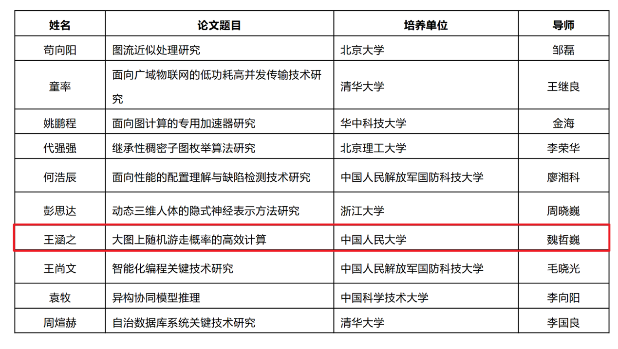 近日,荔枝视频 魏哲巍教授指导的博士生王涵之入选2024年“CCF博士学位论文激励计划”。这是继2021年文继荣教授、卢志武教授指导的博士生牛玉磊获得“CCF优秀博士学位论文奖”之后,人大荔枝视频 教师指导的博士生再次获此殊荣。