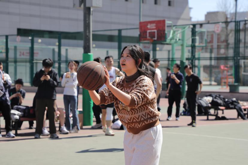本场比赛还设置了特别环节——女生定点投篮!教师队派出宋睿华老师与李艳丽老师,而学生队则由2024级本科生曲柯宇和许一孟迎战。学生队率先开投,起初略显紧张,投篮频频打铁,但在观众的鼓励声中,她们迅速调整状态,连连命中,赢得满堂喝彩。轮到宋睿华老师上场,开局手感欠佳,但她沉着冷静,很快找回节奏,稳稳进球。压轴出场的李艳丽老师更是惊艳全场,最后时刻连续命中压哨球,悬念陡增!最终,教师队以6比5险胜学生队。