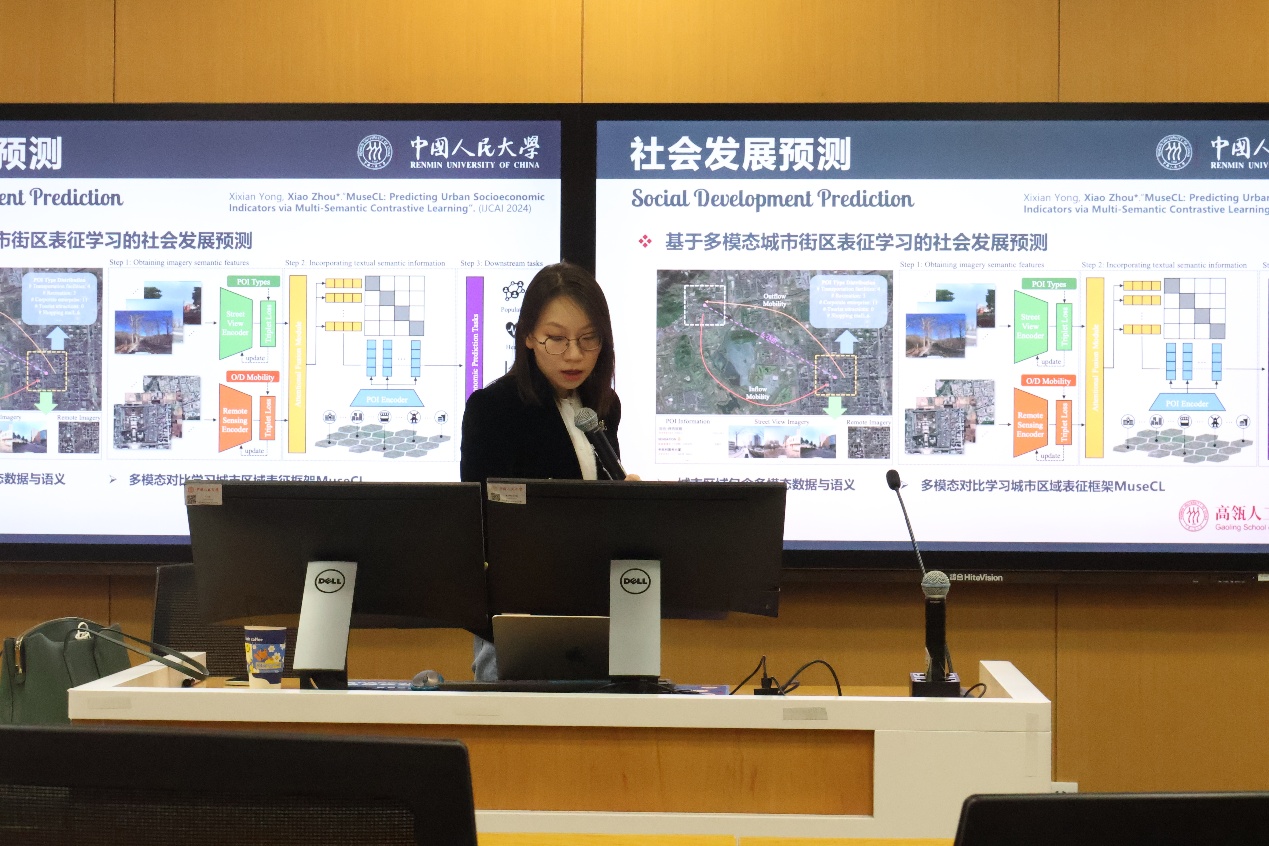 周骁老师以其在人工智能与城市科学交叉领域的深厚积累,从智慧城市的发展历程切入,系统梳理了从“数字城市”到“新型智慧城市”的技术演进与治理变革。她通过多模态数据融合、城市计算模型等案例,生动阐释了人工智能如何破解“城市病”。例如,团队开发的MuseCL框架通过街景、遥感等多源数据对比学习,精准预测区域人口密度、经济发展等指标,为城市规划提供动态决策支持,贯彻了“AI不仅是工具,更是重构城市治理逻辑的核心驱动力。”