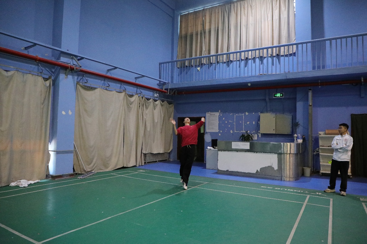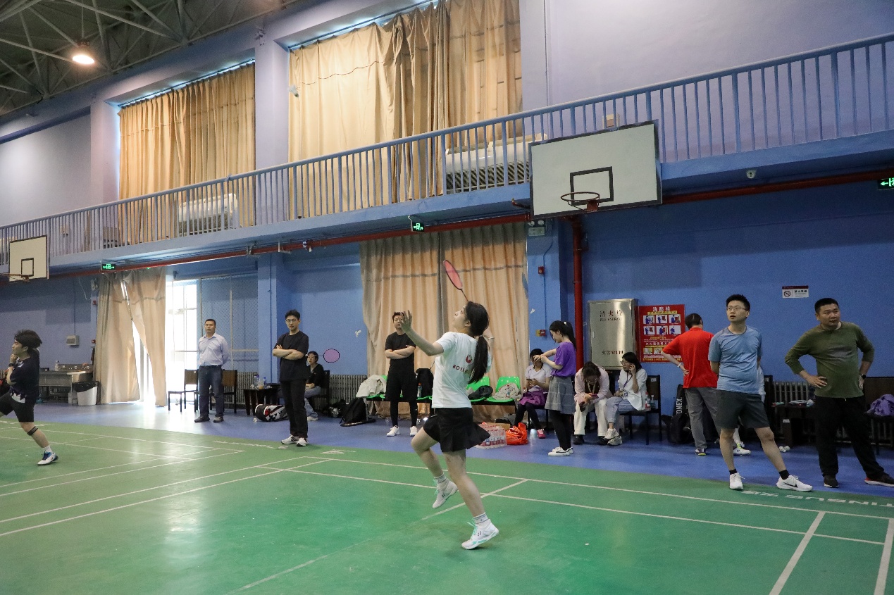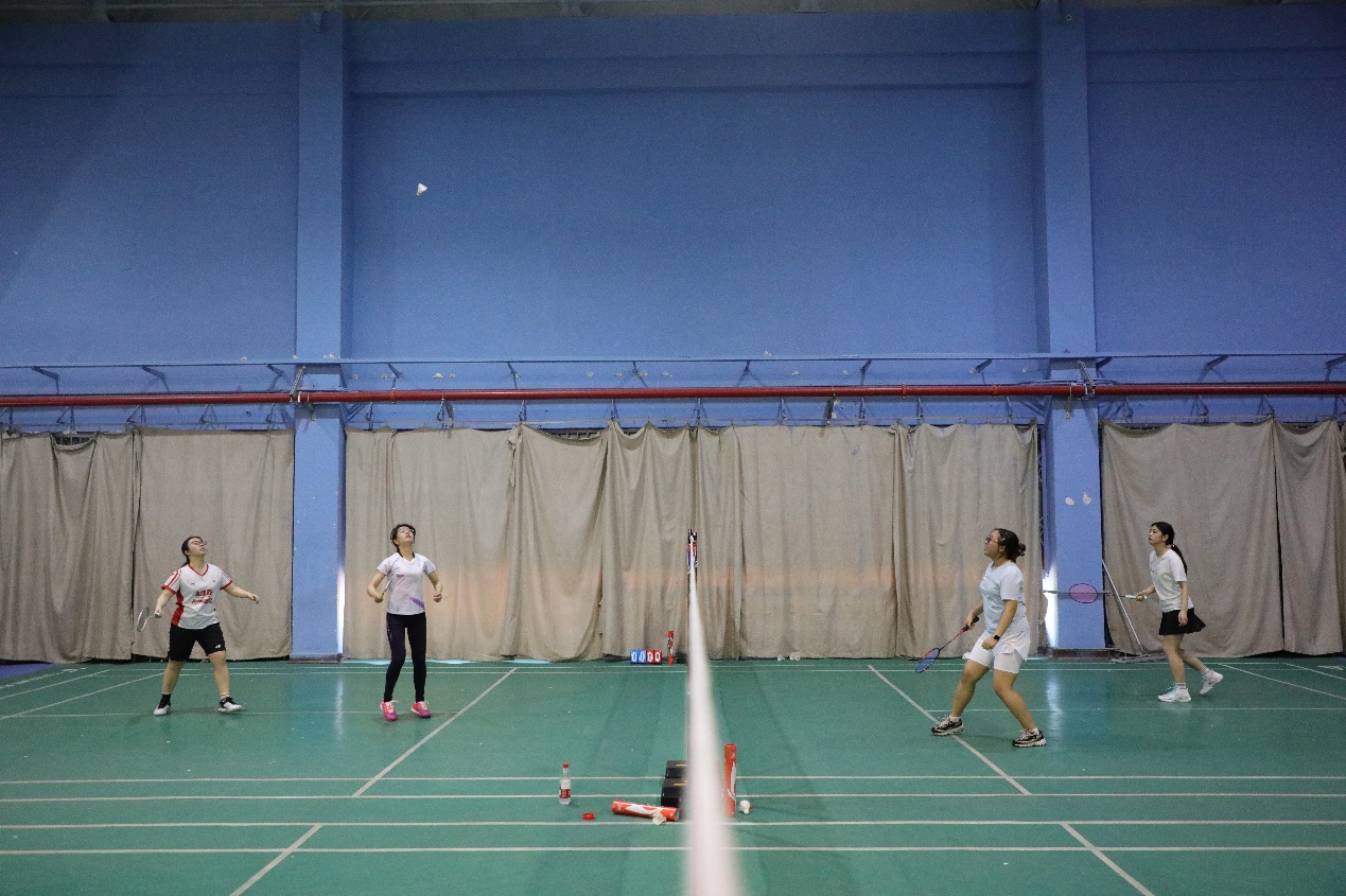 在两场老师之间的比赛过后,同学们也开始上场切磋,呈现多场精彩对局。男单比赛中,大二本科生叶煊楠在先丢一局的情况下,顶住压力连赢两局逆转翻盘;在另一边的女单赛场上,陈晓轩和王诗俊贡献了一场精彩的对攻大战,只见羽毛球在空中不断来回拉扯,绷紧着观众们的心弦;男子双打比赛中,葛宇俊/黄浩博组合与张令/赖慧彬组合展开激烈攻防,两队队员配合默契、不断高接低挡,引得观众连声叫好;而另一片的女双场地上,李晨/王诗俊组合在落后一局的情况下稳住阵脚,在不利局面下相互加油打气,最终2比1反败为胜。