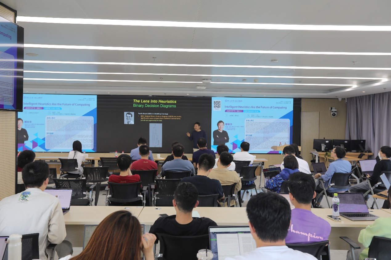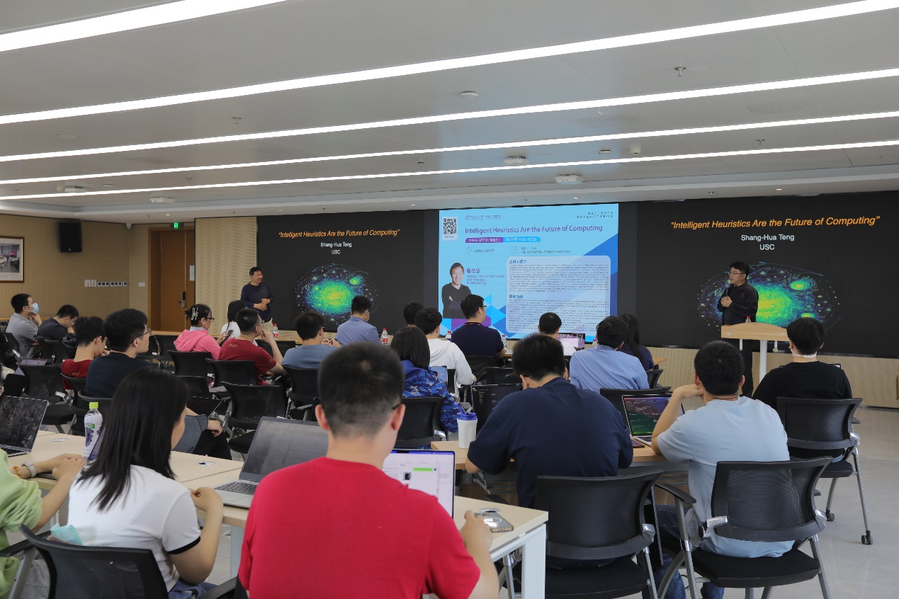 随后,滕尚华教授以 “Intelligent Heuristics Are the Future of Computing” 为主题作了前沿学术报告。报告中,他分享了自己在计算启发式领域的研究经历,介绍了理解启发式在真实数据上行为的理论工作,以及设计具备扎实理论基础的实用启发式方法的实践探索,他从谱划分、多层次方法等多种技术中汲取灵感,期望这些见解能助力人工智能和数据挖掘领域的技术发展。