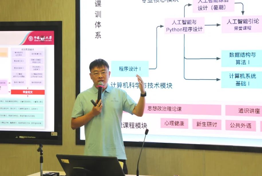 魏哲巍向在场新生系统介绍了学院本科生培养情况,详细解读了2025级人工智能专业及数据计算及应用(智能科学方向)强基计划培养方案。学院构建了“基础扎实、层次清晰、面向前沿”的课程体系,注重理论与实践的深度融合,实施科研领航计划,提供丰富的科研训练、竞赛指导和国际交流机会,支持学生在学术探索与技术创新中不断突破自我,为未来发展打下坚实基础。