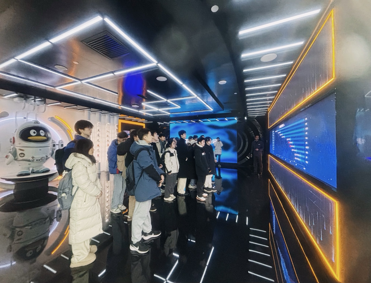 在腾讯工作人员的引导下,同学们首先参观了企业数字化展厅。从社交产品演进到云计算布局,从泛娱乐生态到产业互联网应用,丰富而前沿的展示内容,让同学们近距离感受腾讯作为科技企业的业务矩阵与创新脉络,也对互联网科技的社会赋能价值有了更具象的认知。