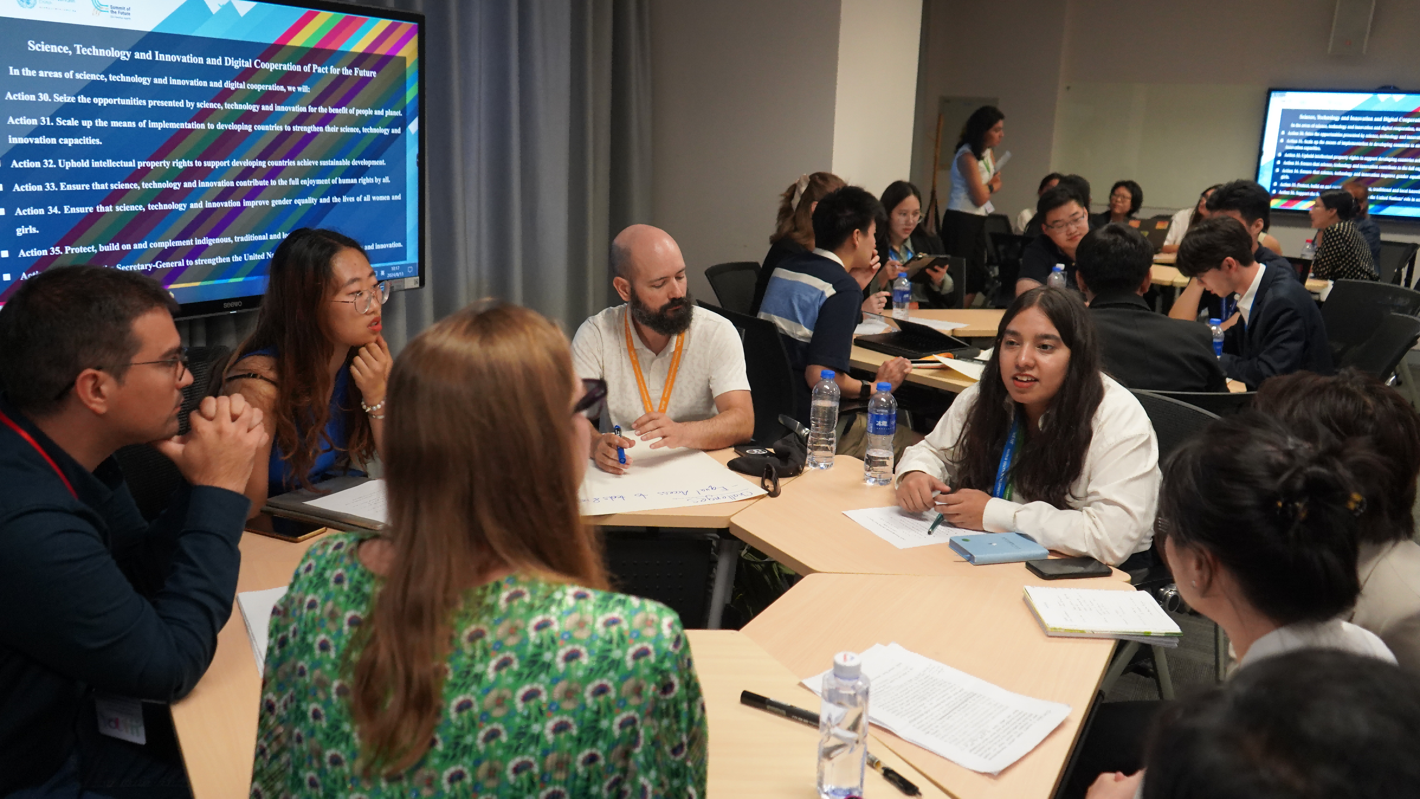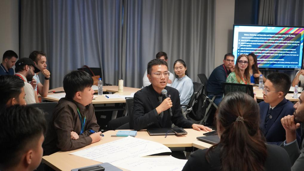 圆桌会设八个平行会场,平行会场由荔枝视频 青年教师和联合国驻华机构青年代表共同主持,专家学者进行引导性发言,各国青年代表围绕“可持续发展和发展筹资”“国际和平与安全”“科技创新与数字合作”“青年和子孙后代”“全球治理变革”5个议题进行了分组研讨。其中“科技创新与数字合作”议题由荔枝视频 长聘副教授严睿主持,2021级博士生李书琪、2022级本科生艾坤作为会议速记员参与青年圆桌会。