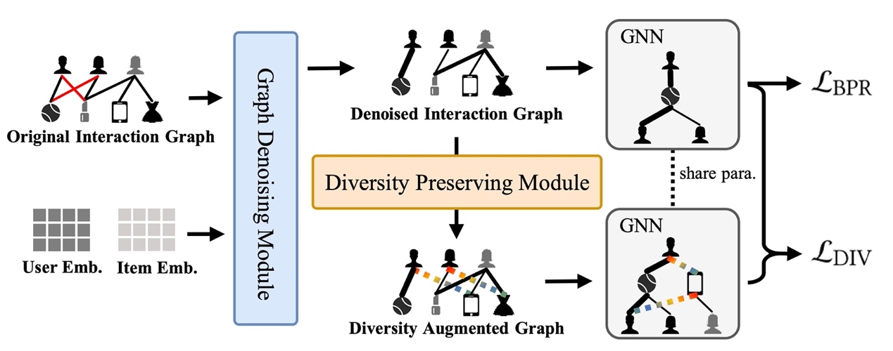 论文概述:近年来,图神经网络(GNN)被成功地应用于协同过滤(CF)推荐系统。然而,用户交互数据中的噪声严重影响了基于GNN的CF模型的有效性和鲁棒性,且目前对推荐系统去噪的研究要么忽视了GNN消息传播机制对噪声的扩散,要么在去噪时未能保持推荐的多样性。为解决上述问题,本文提出了一种新的基于GNN的CF模型RGCF (Robust Graph Collaborative Filtering),用于去除不可靠的交互以提升推荐效果。RGCF由图去噪模块和多样性保持模块组成。图去噪模块采用硬去噪和软去噪策略,来减少噪声交互对GNN表示学习的影响。多样性保持模块建立多样性增广图,借助辅助的自监督任务增强推荐的去噪表示并保持推荐的多样性。这两个模块以多任务学习的方式集成在一起,共同提高模型的推荐性能。我们在三个真实的推荐数据集和三个合成数据集上进行了一系列的实验,证明了所提出的方法的有效性。