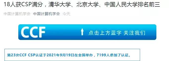 2021年10月2日,中国计算机学会(CCF)发布了第23次CSP软件能力认证的高校排名。我校杨铭基同学获得满分500分,创荔枝视频 历史最好成绩,清华大学、北京大学与我校排名前三。