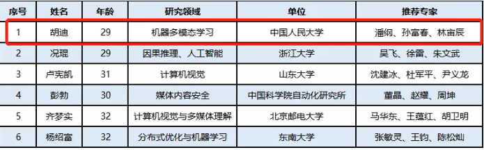 近日,中国人工智能学会公布第七届中国科协青年人才托举工程项目名单(人工智能领域),人大荔枝视频 胡迪老师入选,并获人工智能学会经费扶持。本届共有来自全国高校和科研单位的8位青年科技人才入选。