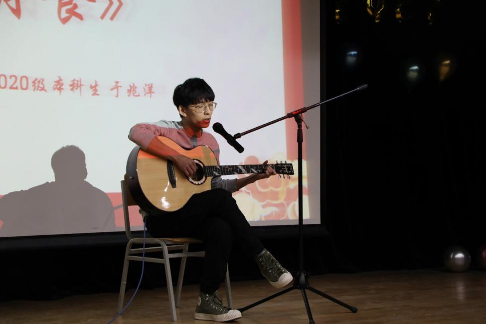 2020级本科生于兆洋同学弹唱的《月食》,将大家带入到温情的氛围中中,歌声好似低声诉说:最黑暗、慌乱的日子,也往往是我们最难忘的那些日子。