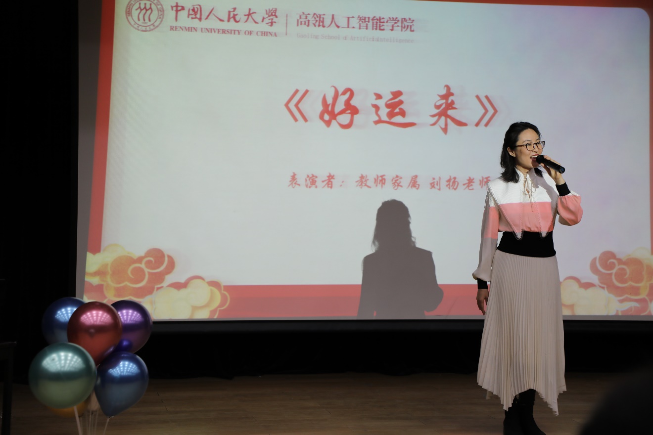 不仅老师们多才多艺,家属后援团也卧虎藏龙。接下来,孙浩老师的爱人刘扬老师以专业水准独唱一曲《好运来》,引得掌声连连。