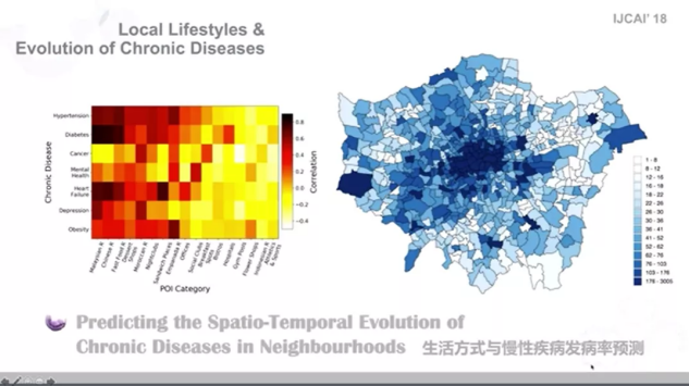 除了智慧城市,周骁研究的兴趣点还有智慧医疗和智慧养老。她的另一科研成果是,利用时空大数据与健康数据结合,来探究不同生活方式与伦敦地区慢性病的关系。他们采用联合主题模型和高斯混合模型提出了可以预测慢性疾病发病率的模型,这样,根据各个社区周边的POI分布情况,可以预测出每个城市区域的各项慢性疾病发病概率。