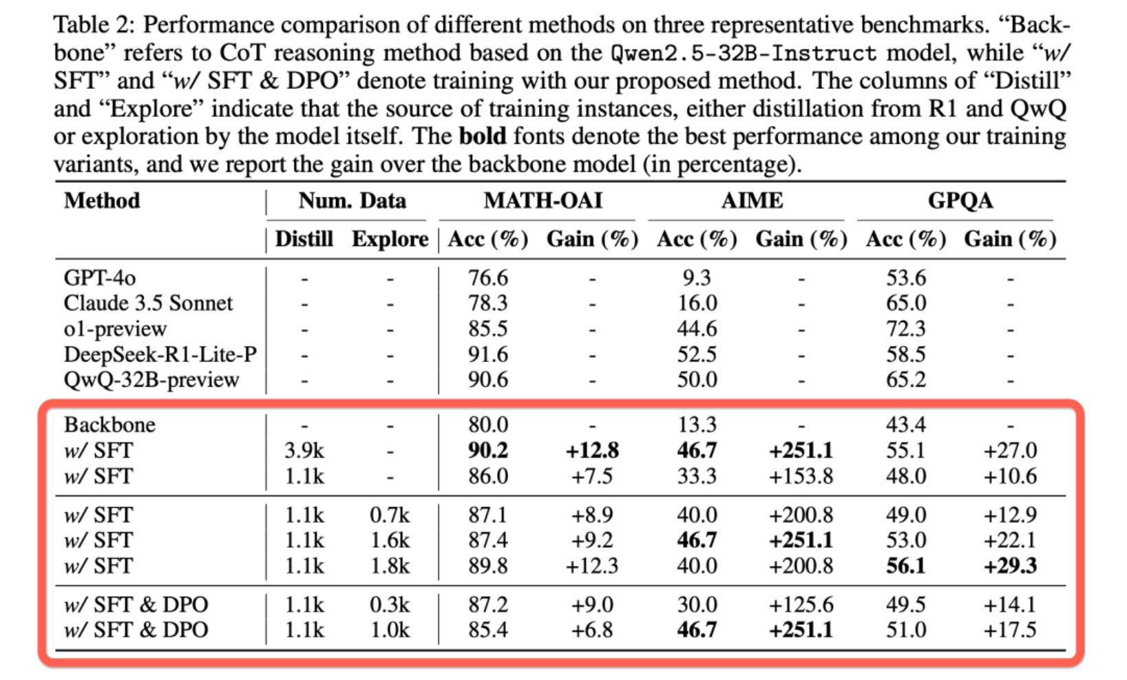 2.使用经过预处理后从和获得的 3.9k 个蒸馏实例进行SFT后,我们的方法在 AIME 上实现了 46.7% 的准确率,在 MATH-OAI 上实现了 90.2% 的准确率(表2第二部分的第一组)。同时,训练数据从 1.1k 增加到 3.9k 带来的效果表明,增加高质量数据的数量可以有效提高模型性能(表2第二部分的第一组)。