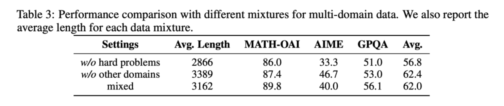 仅使用数学数据(不包含其他领域数据)有助于提升 AIME 的性能,但对 MATH-OAI 和 GPQA 的性能有负面影响。