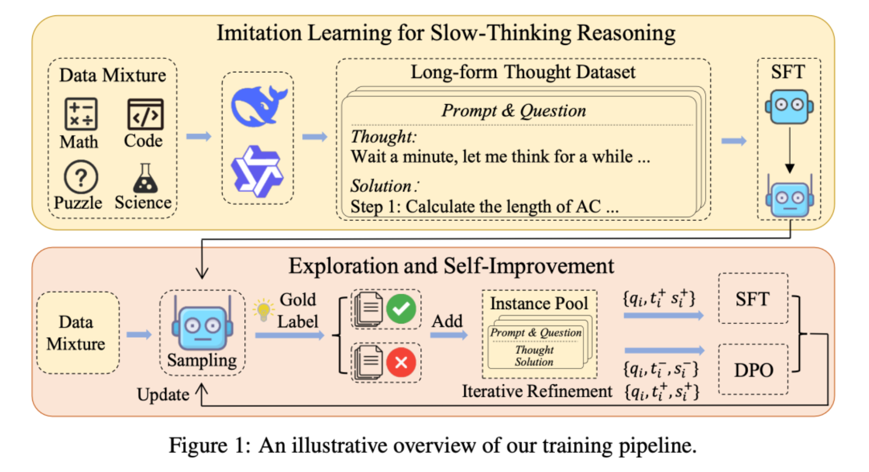 为了实现这一目标,我们提出了一个“模仿、探索与自我提升”的三阶段训练框架。该框架旨在通过训练模型模仿长思维链中的思考模式,鼓励模型在面对具有挑战性的问题时进行深入探索,并通过迭代改进训练数据,不断提升模型的推理能力。